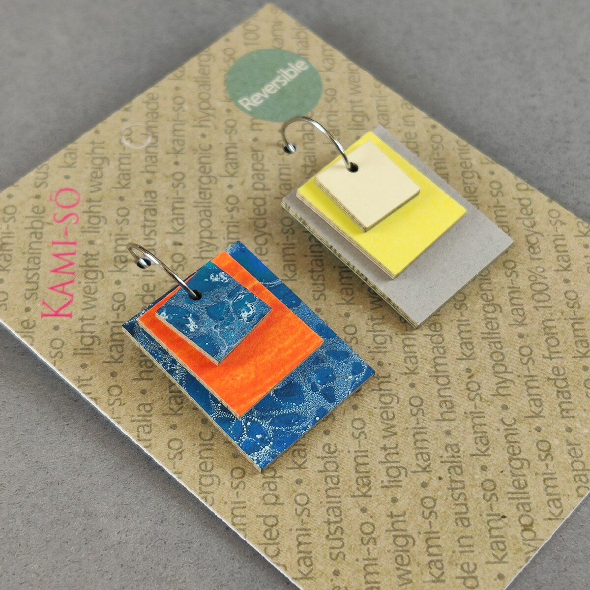 Reverse-A-Tile Expanding Rectangle Recycled Paper Earrings - Blue & Orange / Cream, Yellow & Light Grey