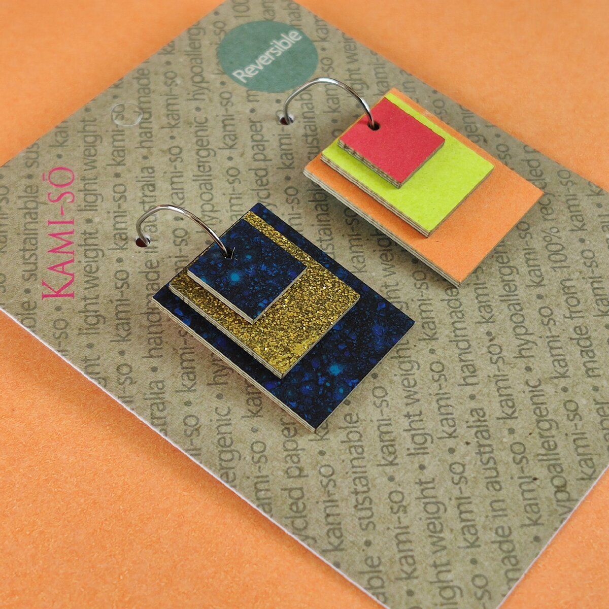 Reverse-A-Tile Expanding Rectangle Recycled Paper Earrings - Dark Blue & Glitter Gold / Red, Lime & Orange