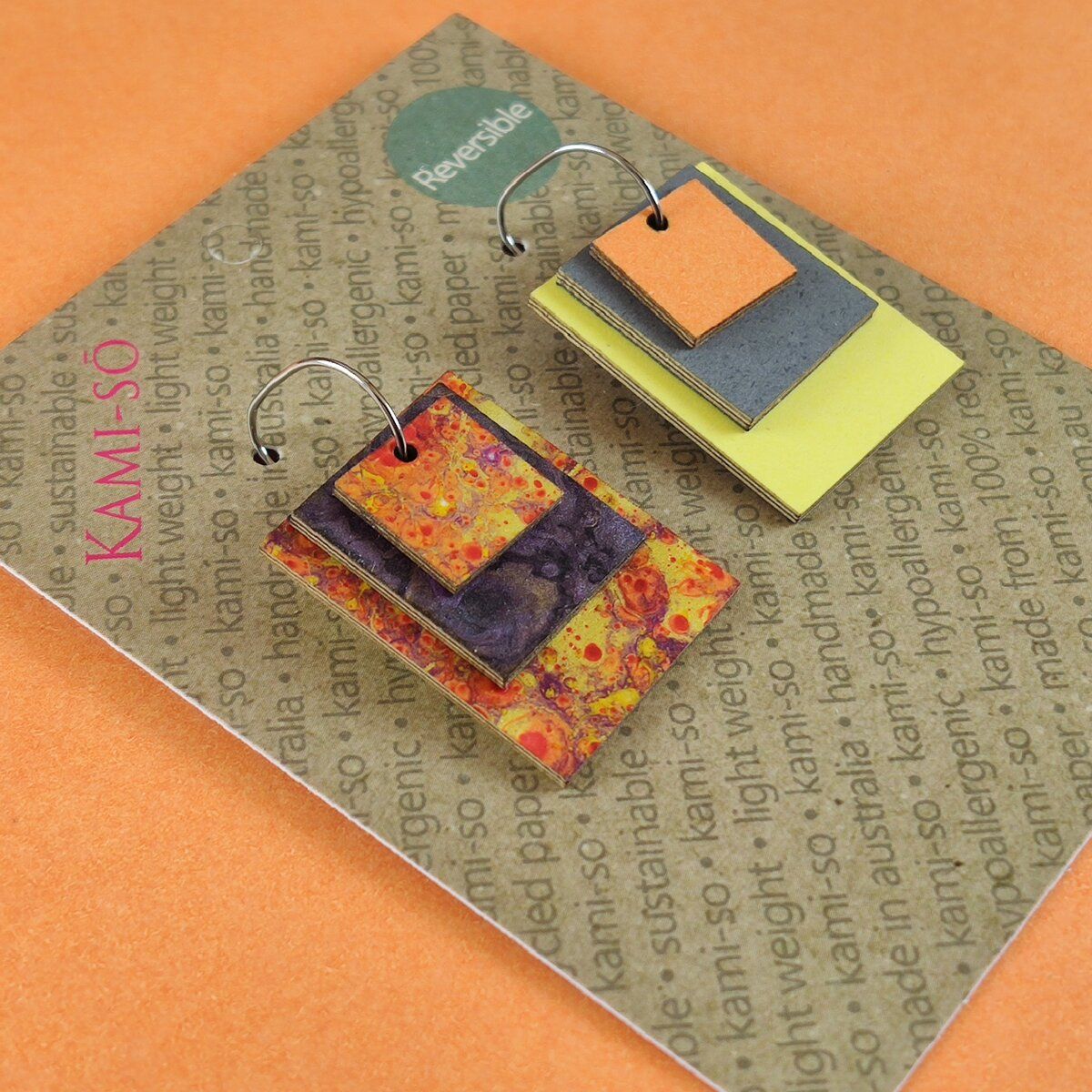 These fun, lightweight recycled paper earrings feature three interchangeable double-sided tiles cut from hand-painted artworks on one side, and solid colours on the other. Choose any combination of one, two or three tiles to create the perfect colour combination. This one pair of earrings can actually be worn up to 26 different ways!