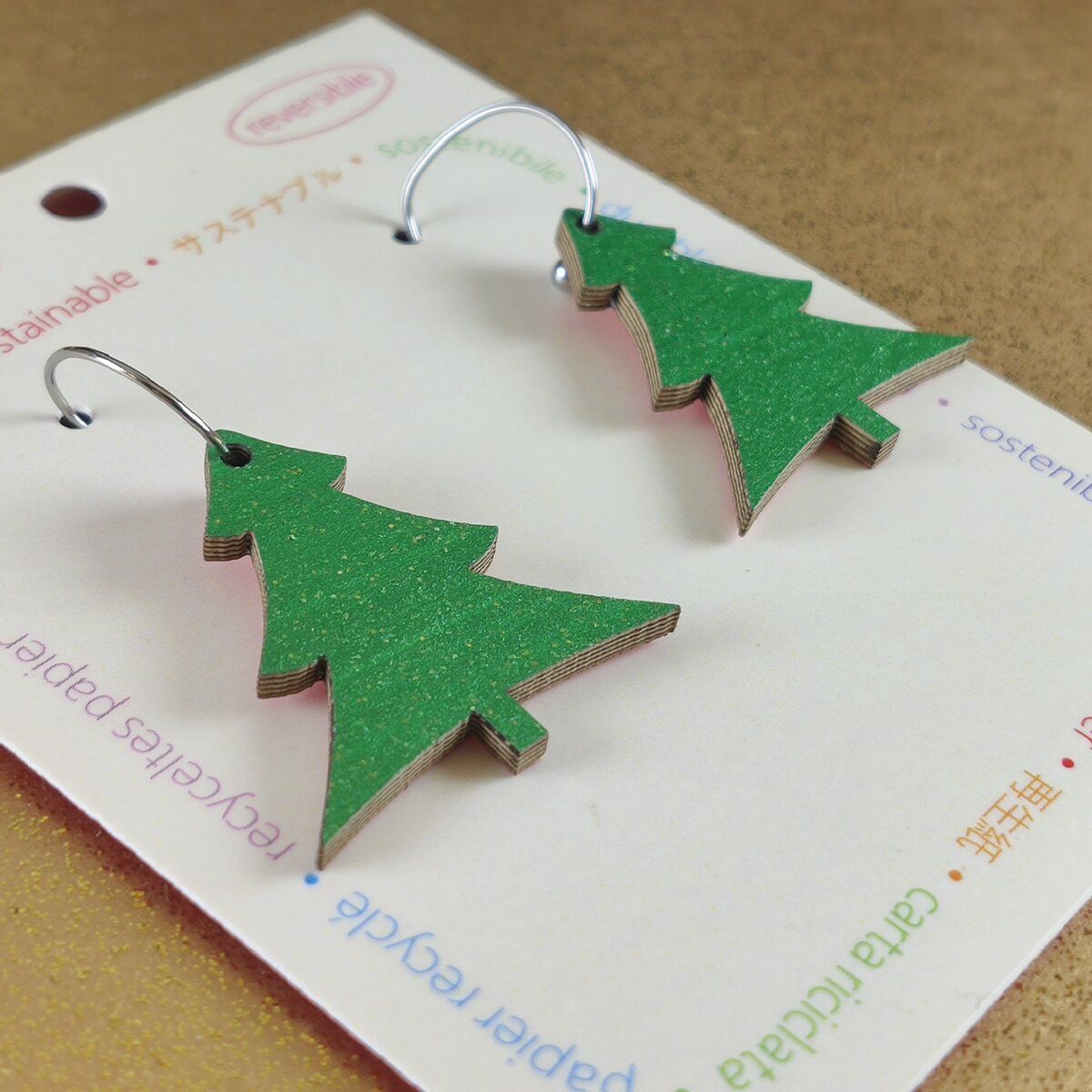 Reversible Christmas Tree Recycled Paper Earrings - Green Sparkle / Red Sparkle